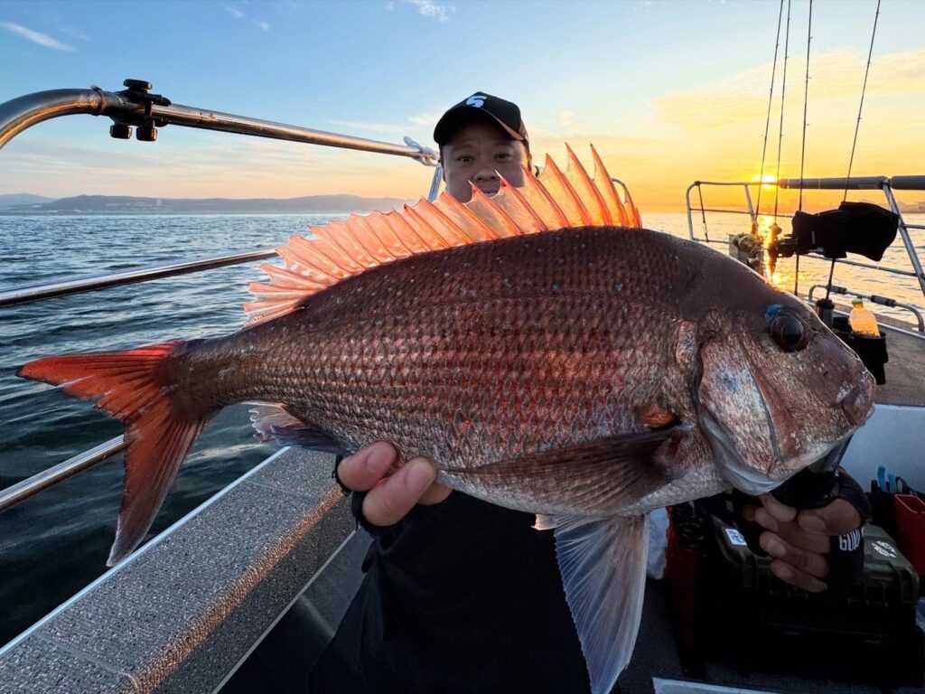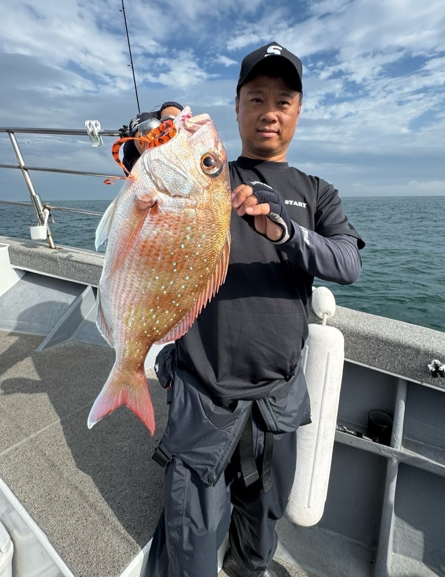 最終の日暮れ間際には、シリコンネクタイシングルカーリーを少しカットしたカスタムネクタイで、50センチオーバーの良型真鯛をキャッチ!