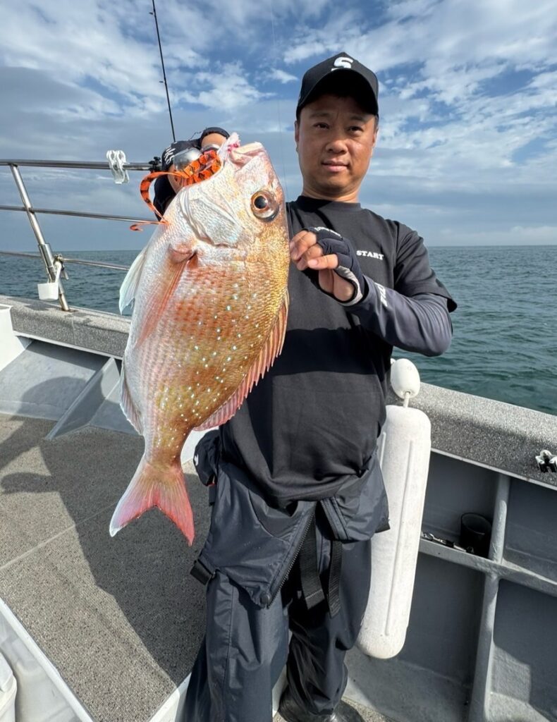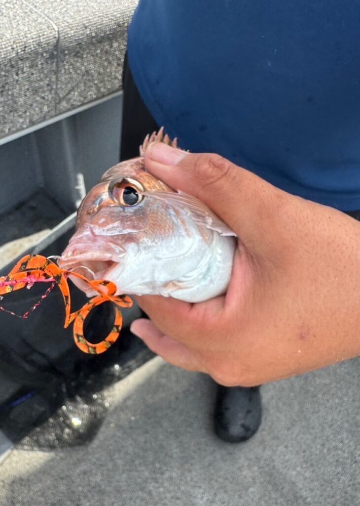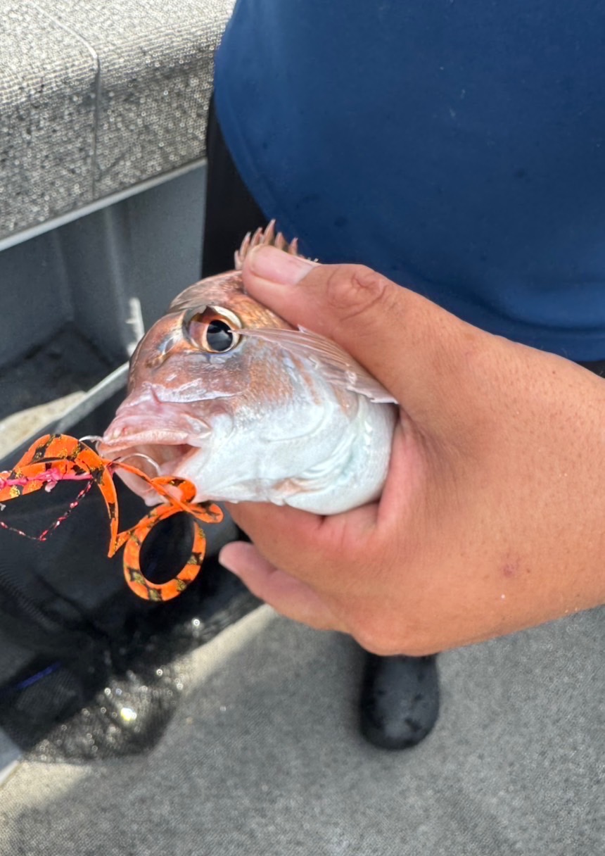 底を中心にスローに探っていき5回転程でバイトがあり、サイズは大きくないですが真鯛がヒットしました。
