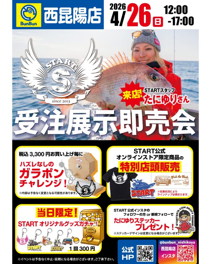 2026年4月26日(日)に兵庫県の釣具のブンブン 西昆陽様にてSTART 春の新製品 展示即売会を開催します!!!